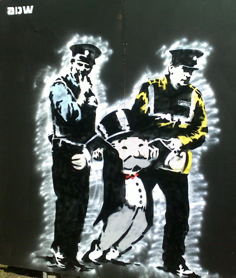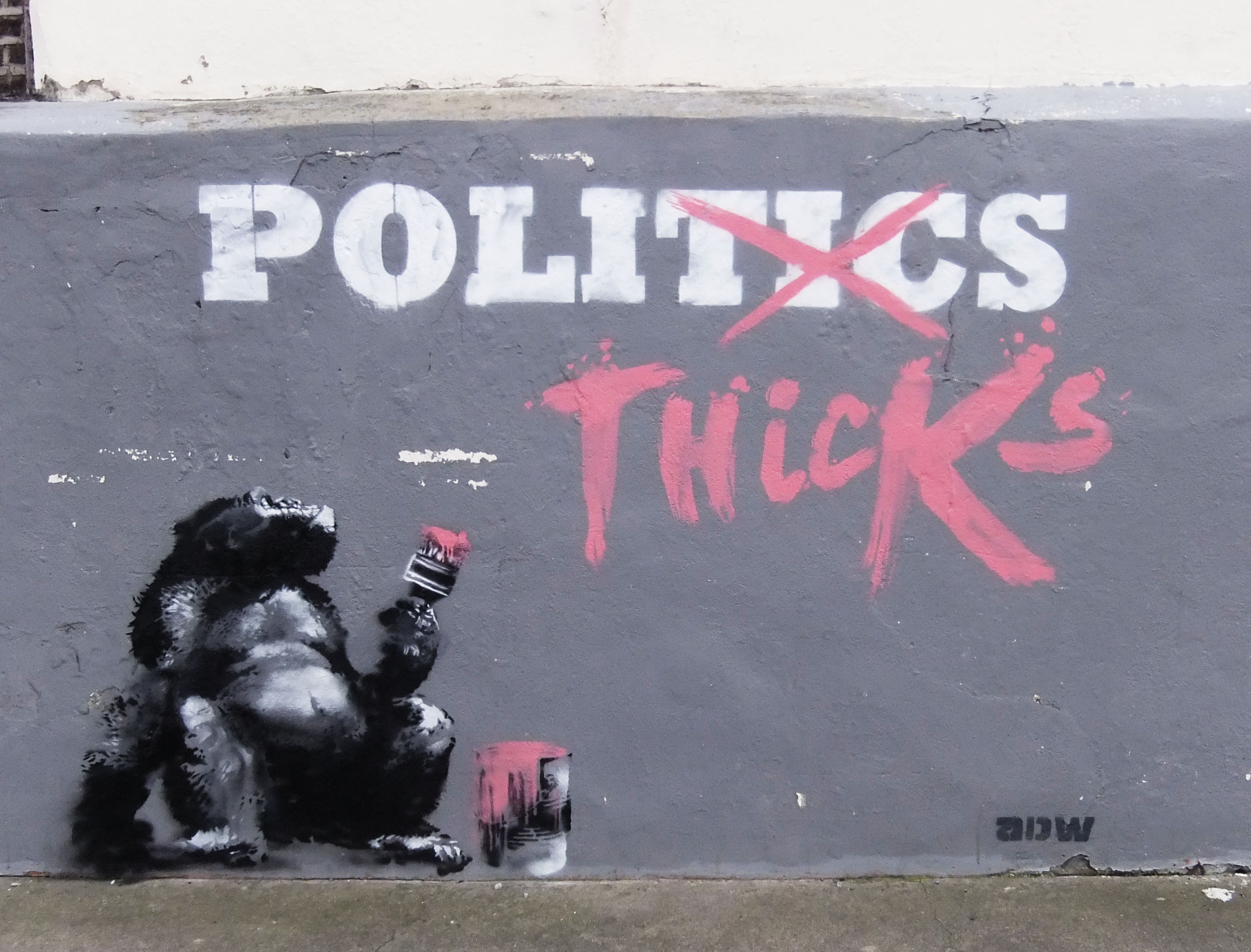 When making a stencil piece for the street as opposed to one for canvas, the card used to make the stencil must be a lot more durable so it can be moved around quickly and is weather resistant. When working on the street, ADW says that he uses less colour in his pieces because of the speed at which he needs to work. The piece below, Politics, 2012, which is near Ranelagh in Dublin, took a matter of minutes to get on to the wall.