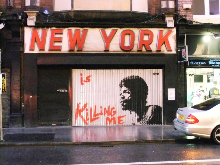 Plans for making work on the street are always carefully premeditated, but things can still get in the way. A recent work, New York is Killing Me, despite only taking a few minutes in total to execute, took a twoweeks to finish because a woman from the area came across ADW in the process of making the work and he had to leave. The piece was painted over two days after it was completed. ADW said he was not too bothered by this because the piece had a personal significance for him and he was glad that he had the chance to finish it as well as get some video footage of the process.
