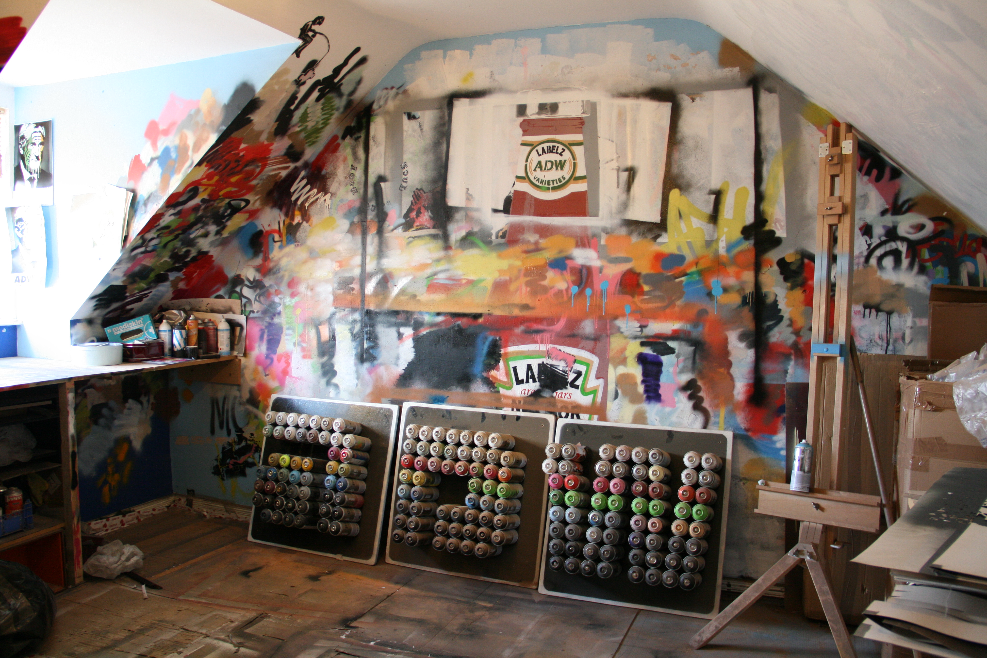 ADW is an artist that works both on the street and on canvas. Whichever form his work takes it always has a personal, political or satirical story behind it. I met him in his studio to talk to him about his practice.
