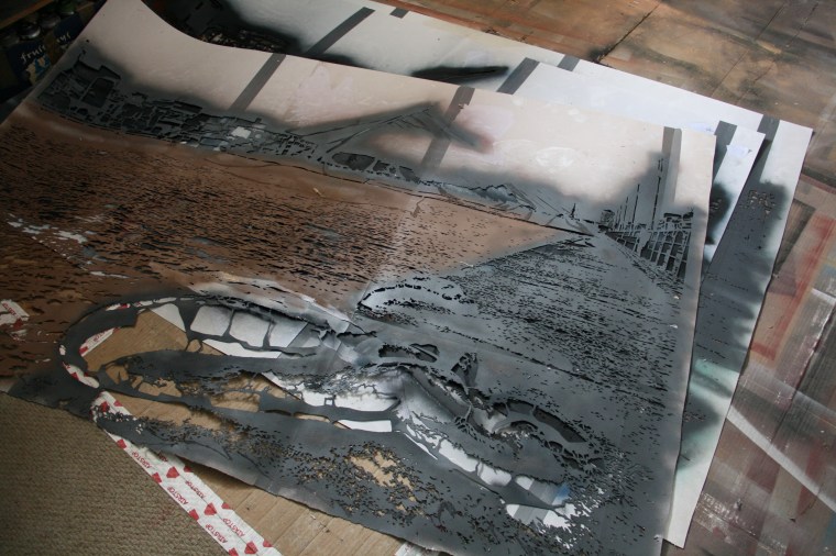 Stencils cut out for The Tide is High but I’m Holding On, 2012