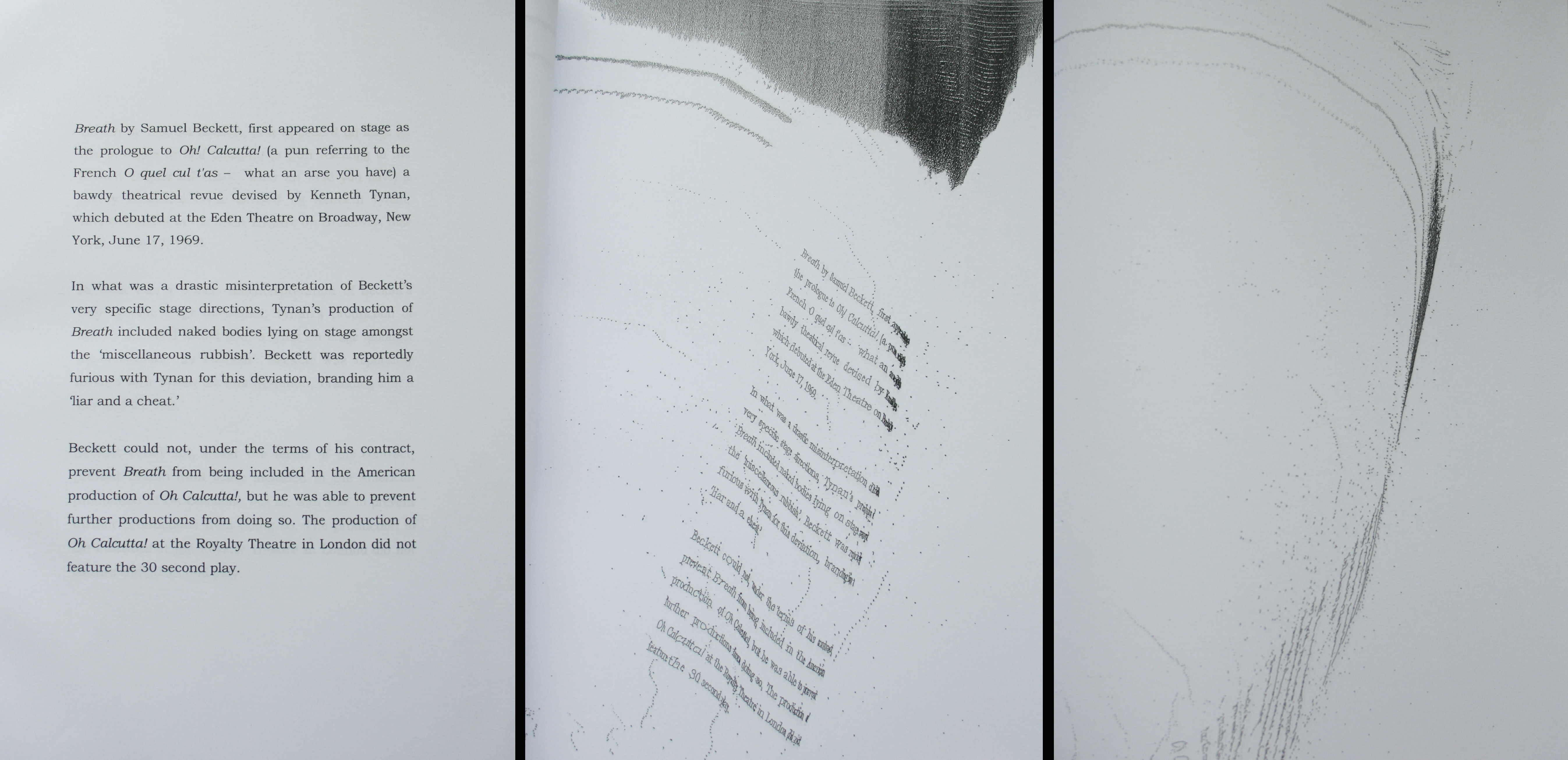 A recent text-based work Barbara made is Breath: an exercise in omission. This consists of 200 photocopied pages of a one page description and analysis of Kenneth Tynan’s production of Samuel Backett’s play Breath, with which Beckett was very unhappy. Barbara was interested in the fact that Beckett chose to omit this play from his overall life’s work and through her work she considered how meaning and value are corrupted by interpretation. It is compelling to see how the words of the first page are gradually omitted as you turn through the photocopied pages in the book.