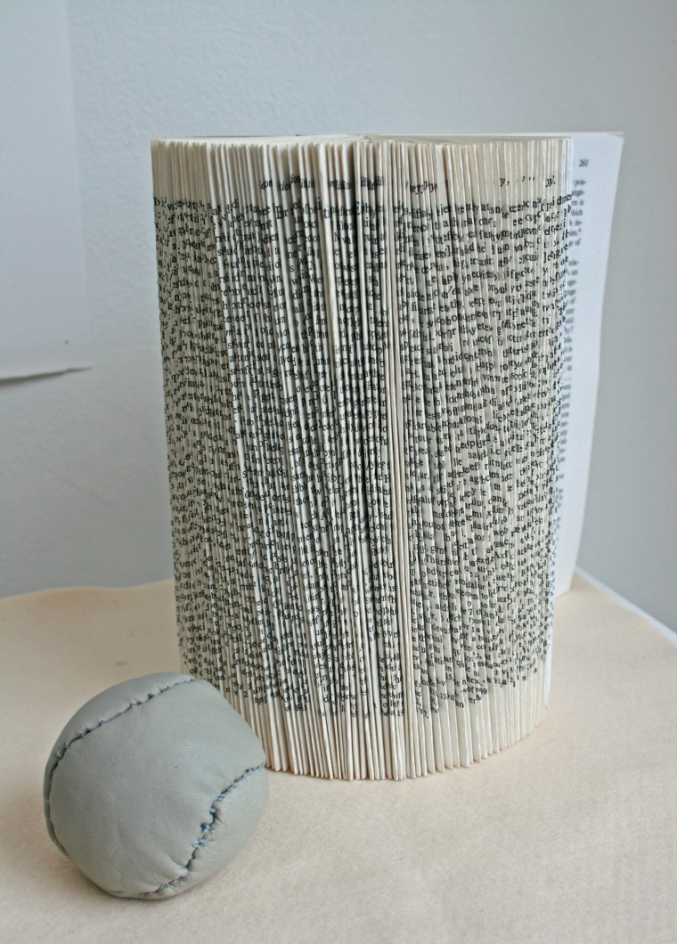 She has taken Karl Marx’s book Capital and is folding each individual page. It is a long process and is something she will have to do in instalments because she says it’s too consuming to do over a long time. It is the book completely unaltered except that the pages have been folded.