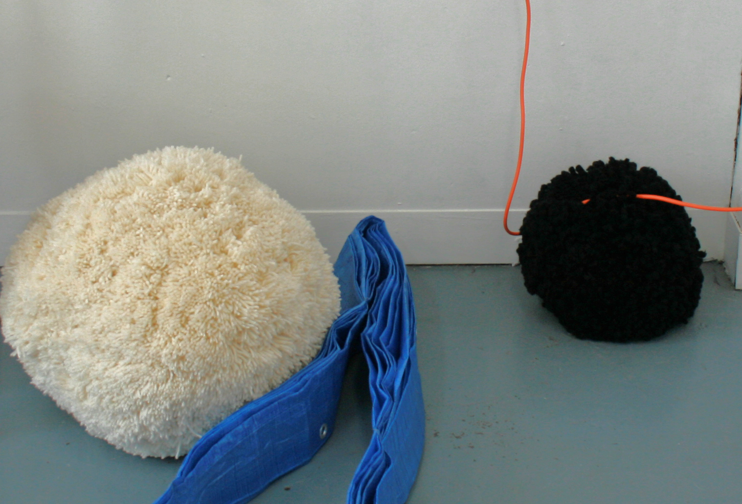 Barbara uses a wide variety of materials for her work – wool, balloons, umbrellas, wood, rocks. I was curious as to how she selects the materials she works with. She says that she is coming to realise that she chooses materials that have in some way already been ‘produced’. For example, the wood she uses in some of her works is mass produced in order to be made into broom sticks. The wool used in other works was already intended for a particular use before Barbara re-interpreted it. She says what is emerging to her is that she is selecting things that are already in circulation for a different purpose.