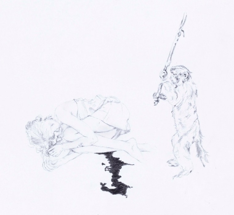 Synthetic biology is whereby synthetic organisms are created by combining science, technology and living forms. Its aim is to design and construct new forms not found in nature. Lydia says we should be thinking of the moral consequences of what this could become if it is not controlled. Her drawing “Them and those” is a parody of what could happen. A monkey that has evolved through synthetic biology is standing in a threatening pose over a young girl. This new life that has been created could so easily go beyond the control of man.