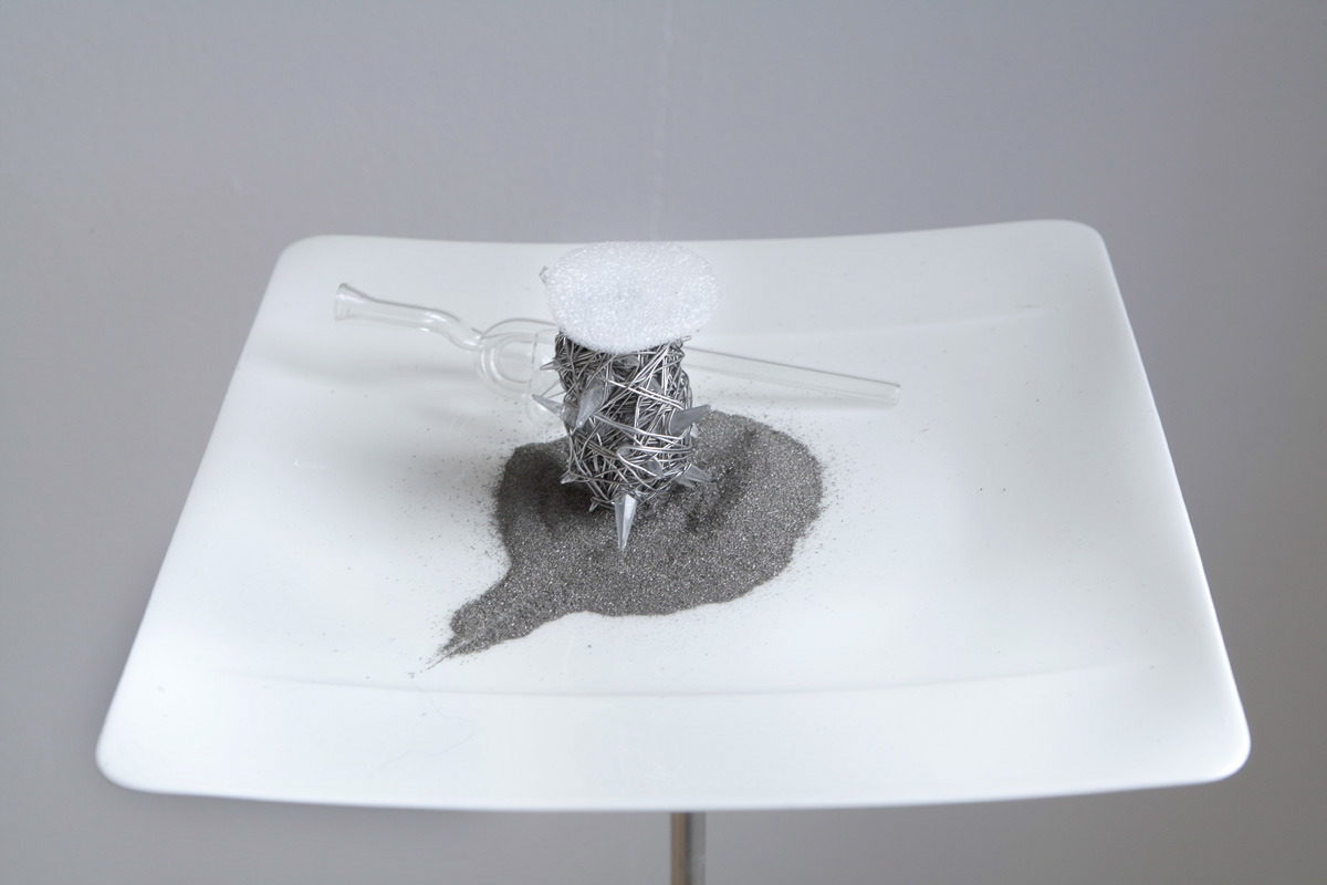 As part of her current exhibition Lydia has made some sculptural forms. She said they came about in quite a natural way, directly influenced by the Futurist Movement. She collected found objects both from the 1900’s and from now and has reconstructed them in such a way that they make a totally new form.  A small tree with silver branches was made from deconstructed radio diodes.  With some of her sculptures she is interested in representing what is possible through science now and is satirizing the cloning process and its results.