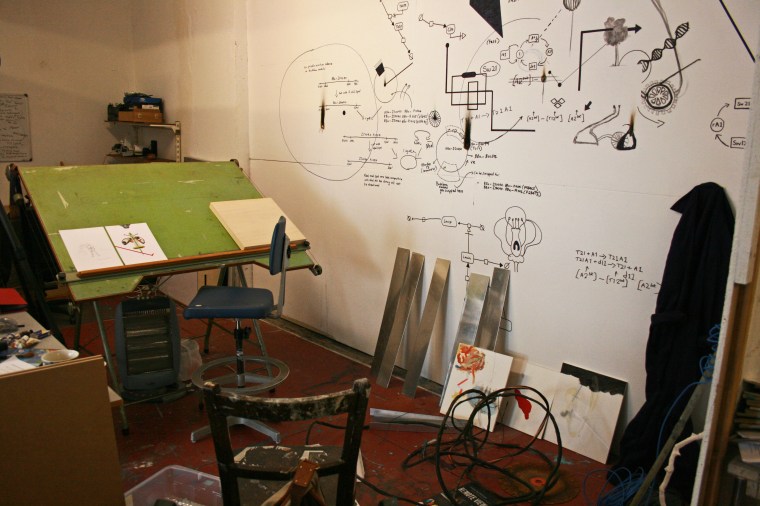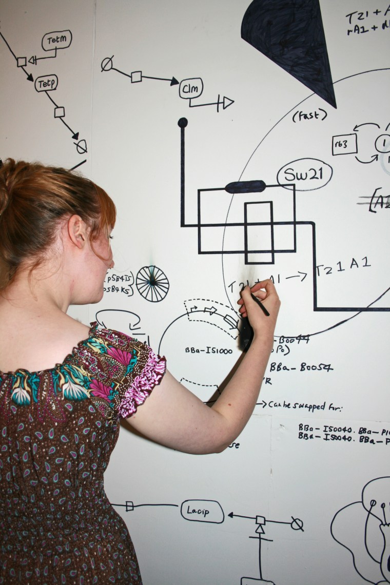 Lydia is interested in introducing more of a performative element to her art and recently she made a piece in her studio that she sees as a sort of parody of science. She replicated on a wall, an experiment she saw in a university archive video where scientists are trying to define what synthetic biology is. Because this is a relatively new area in science there are few definitive answers yet and so the scientists do not know exactly where the experiments are going and she said it was quite humourous to watch. Lydia did mock experiments using table fireworks stuck onto the wall over the wall drawing. She is considering doing the wall drawing piece, which shows the same formulae the scientists use in the video, as a live performance.