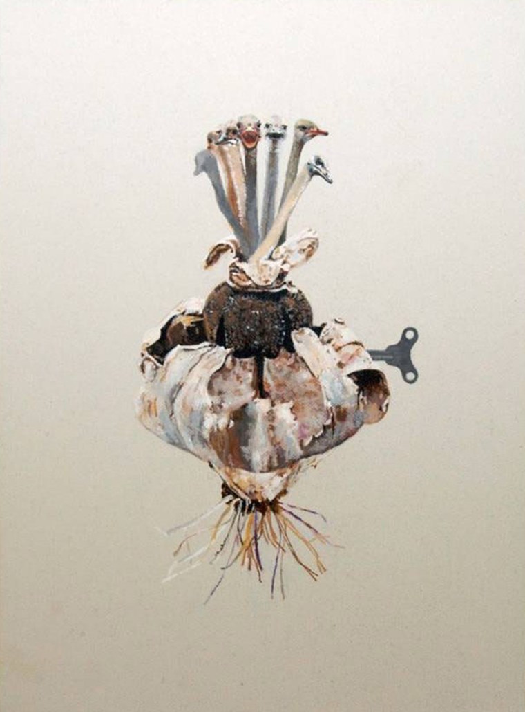 She currently has an exhibition at Queen Street Studios, entitled “Bio-technia” which runs until 1st October. One of the paintings in the exhibition is of a group of ostriches emerging from an unknown plant – we don’t know what it is but we can imagine that it has evolved from something we once knew. This, like some of her other work, shows anatomical and botanical influences.